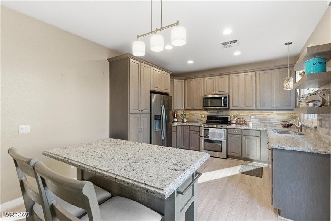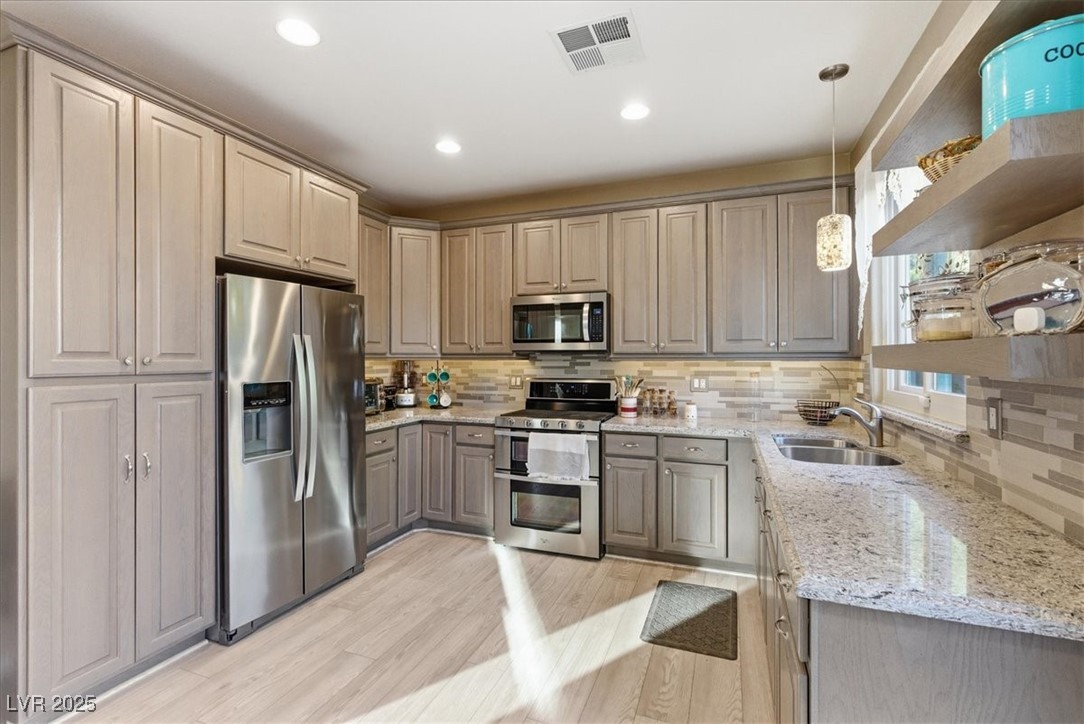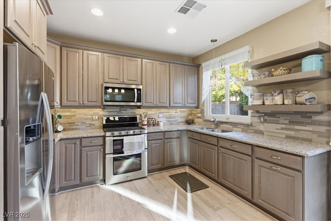 Beautiful single story home located in desirable Summerlin South! This 3 bedroom, 2 bathroom residence offers an inviting layout and a bright, updated kitchen featuring granite countertops, matching stainless steel appliances, an island, and a window overlooking the yard. The primary bedroom includes large windows for plenty of natural light, an en suite bathroom, and a walk-in closet. Convenient laundry area with built-in cabinets. Situated on a corner lot, this home offers a spacious backyard with low-maintenance desert landscaping, perfect for relaxing or entertaining. Two car garage and great curb appeal complete this charming property!